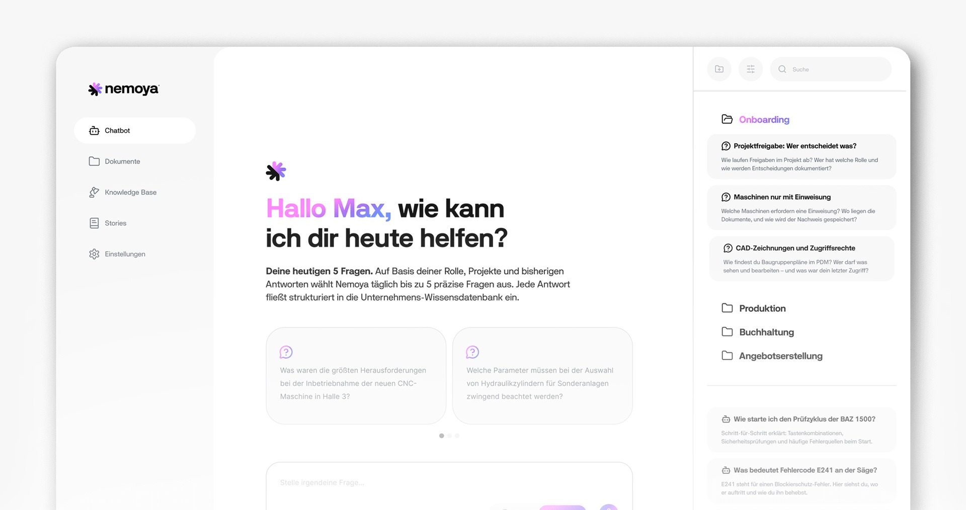 Ob neue Mitarbeiter oder langjährige Fachkräfte – mit Nemoya finden alle relevante Antworten sofort im Chatbot.
